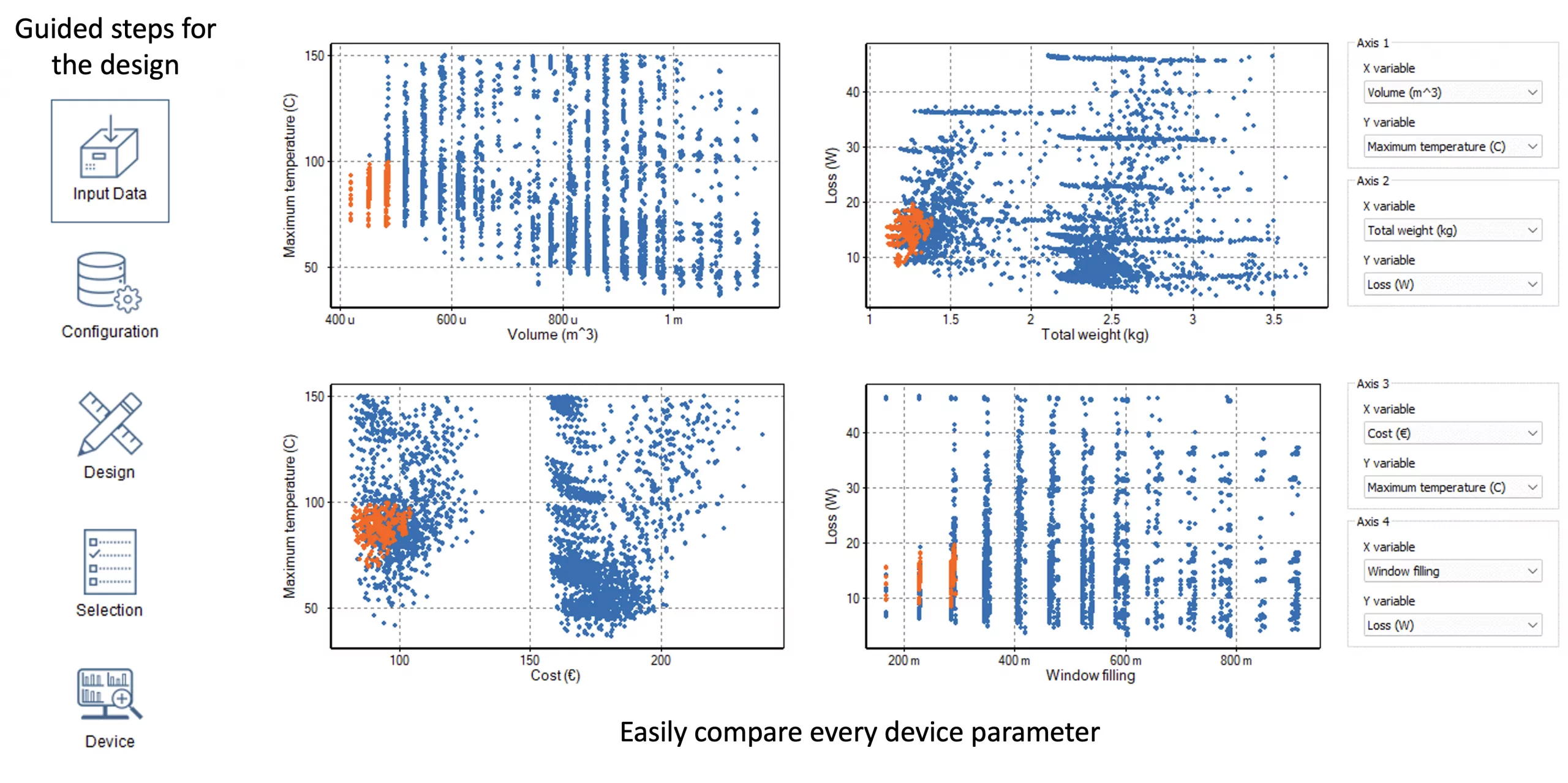 - Select up to six figures of merit and compare thousands of designs immediately.