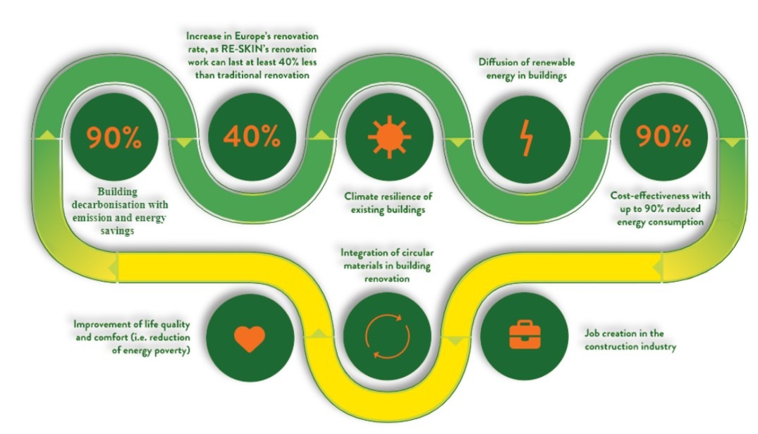 RE-SKIN is developing an advanced, integrated, and multifunctional retrofitting system designed to renovate the European building stock by combining energy efficiency, smart readiness, sustainability, and circular economy principles.